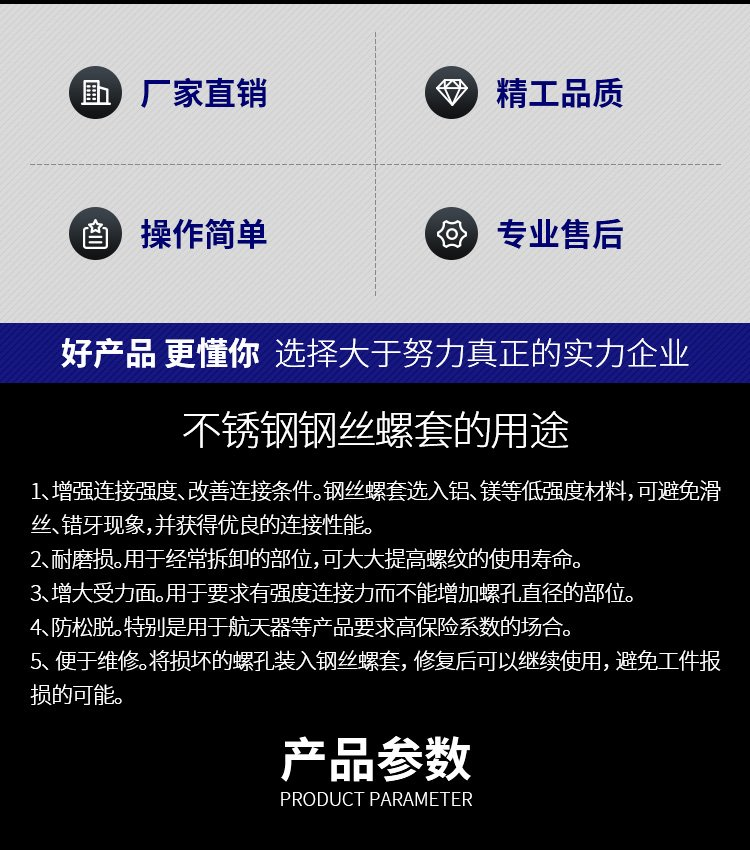 簡易螺紋護套安裝工具有螺紋頭、光桿兩種。用于少量安裝,一般維修、實驗時用,操作時不易安裝,鋼絲螺套容易報廢。